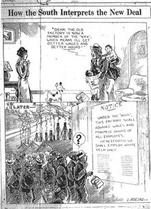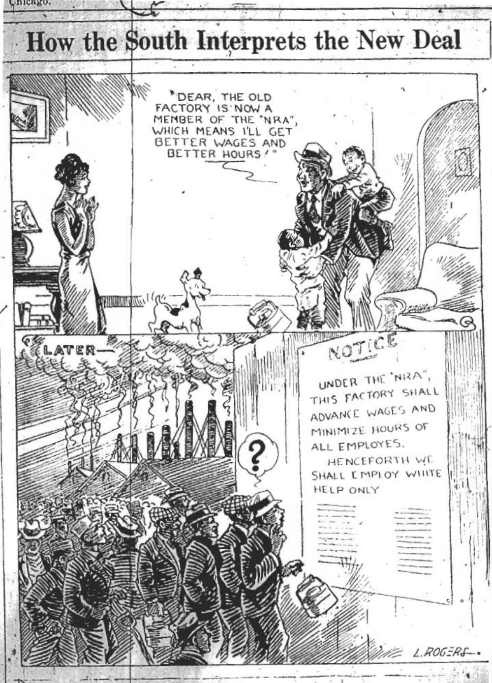[Text: "Dear, the old factory is now a member of the "NRA" which means I'll get better wages and better hours. Later: Under the "NRA" this factory shall advance hours and minimize wages of all employees. Henceforth we shall employ white help only."]